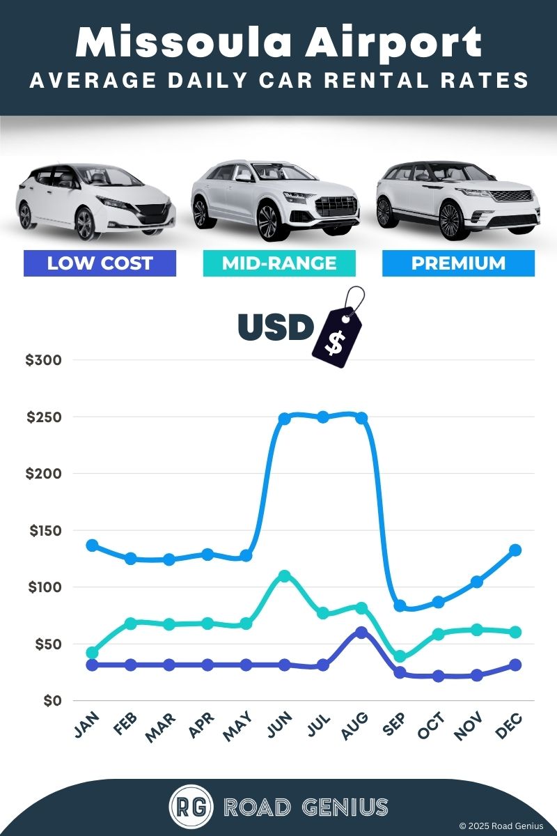 On average, car rentals at Missoula Airport cost around $83 per day, with the lowest-priced rentals starting at $22 per day.