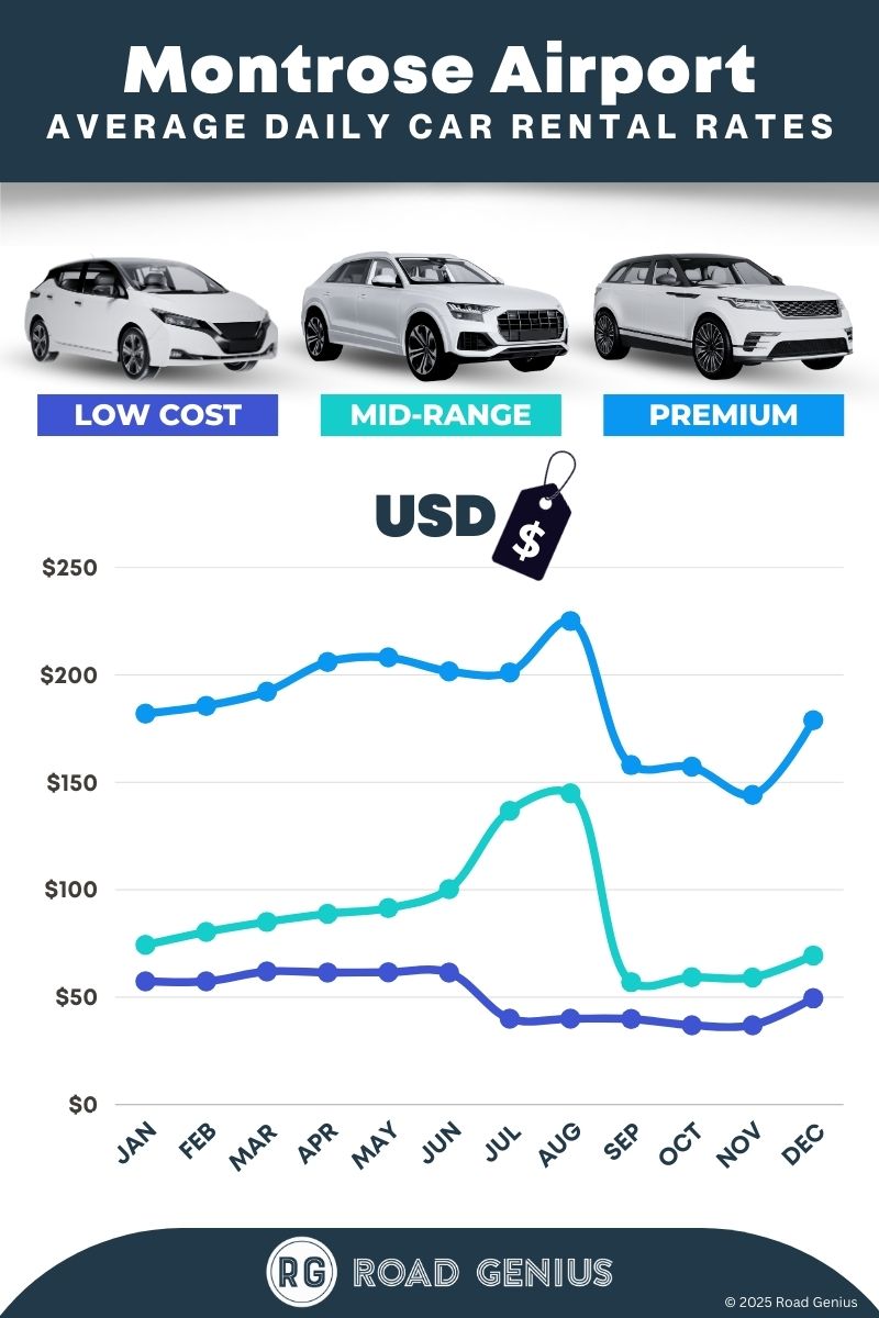 On average, car rentals at Montrose Airport cost around $108 per day, with the lowest-priced rentals starting at $37 per day.