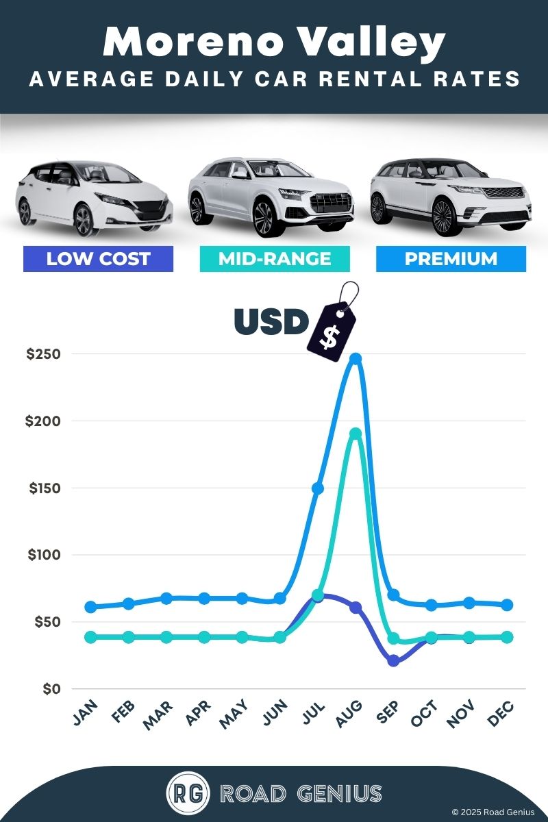 On average, car rentals in Moreno Valley cost around $61 per day, with the lowest-priced rentals starting at $21 per day.