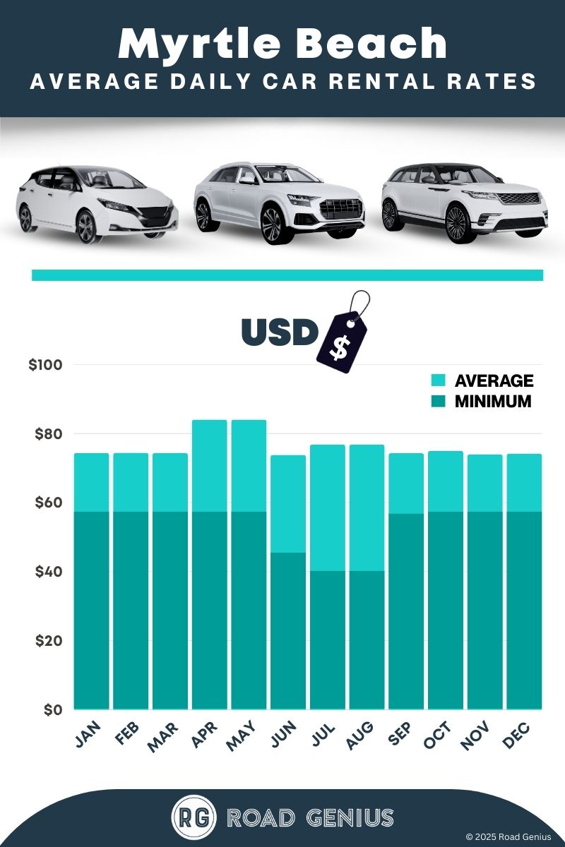 On average, car rentals in Myrtle Beach cost around $66 per day, with the lowest-priced rentals starting at $40 per day.