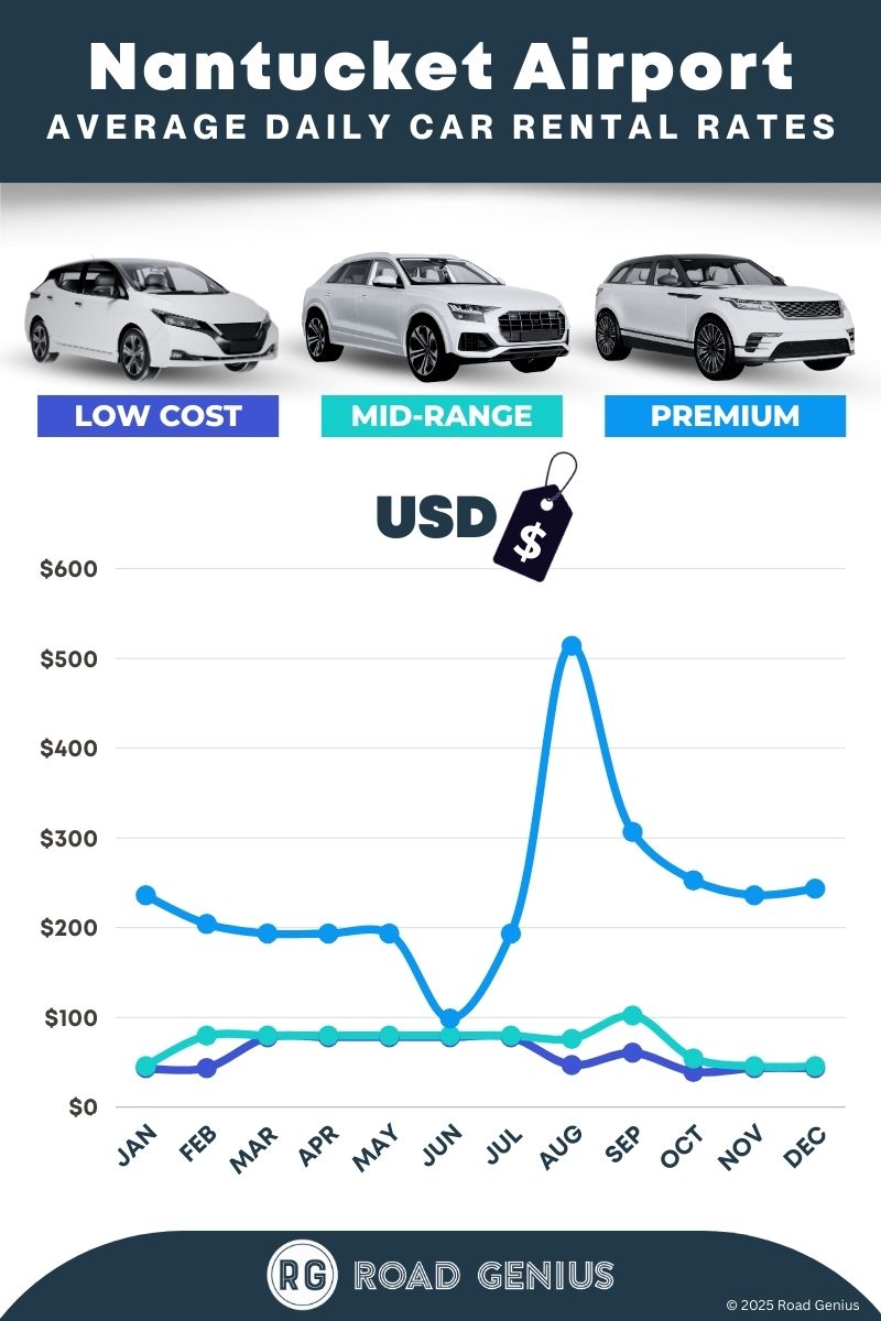 On average, car rentals at Nantucket Airport cost around $123 per day, with the lowest-priced rentals starting at $39 per day.