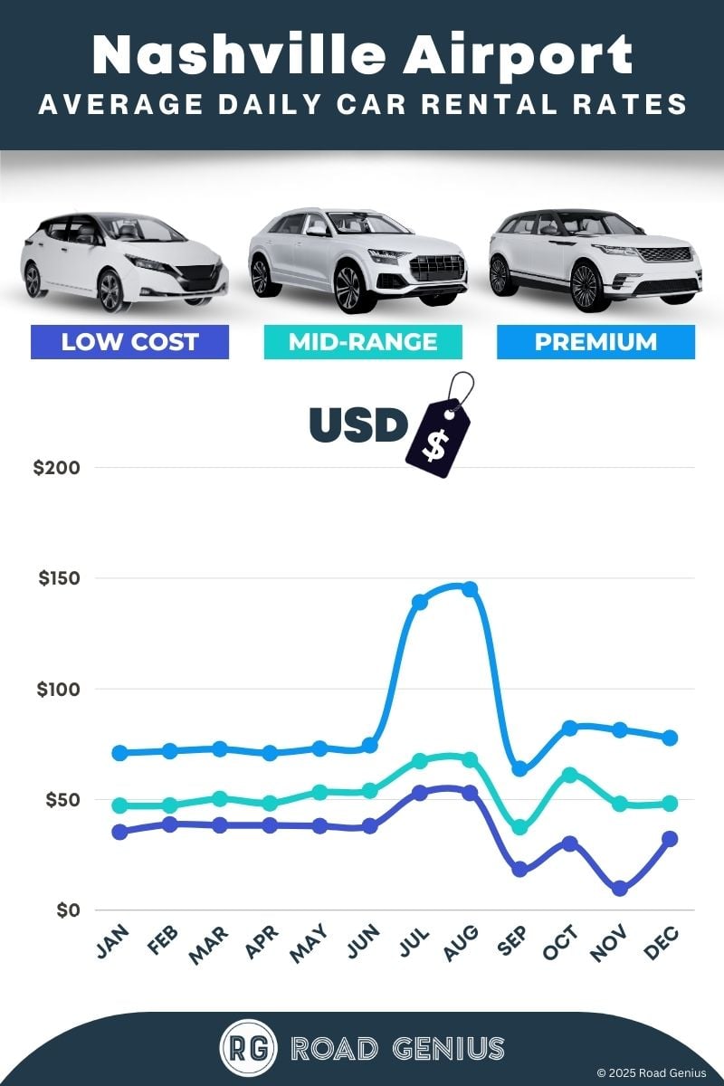 On average, car rentals at Nashville Airport cost around $58 per day, with the lowest-priced rentals starting at $10 per day.