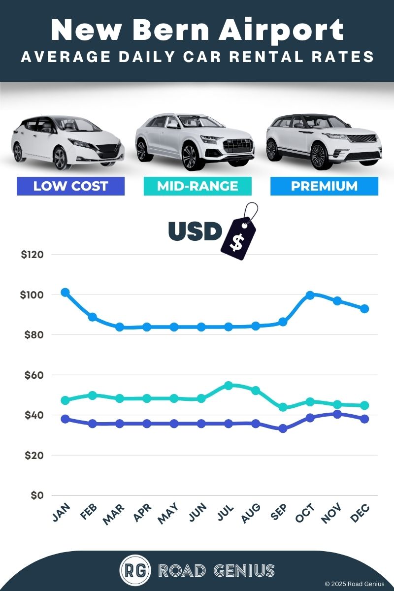 On average, car rentals at New Bern Airport cost around $58 per day, with the lowest-priced rentals starting at $33 per day.