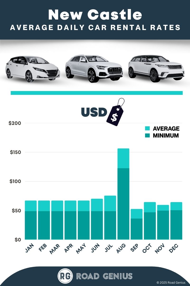On average, car rentals in New Castle cost around $65 per day, with the lowest-priced rentals starting at $36 per day.