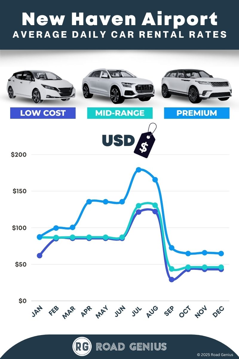 Price-check on-airport vs downtown New Haven – downtown New Haven desks are roughly 18 % cheaper. Even after a $15-20 Uber each way, week-long rentals usually come out ahead.