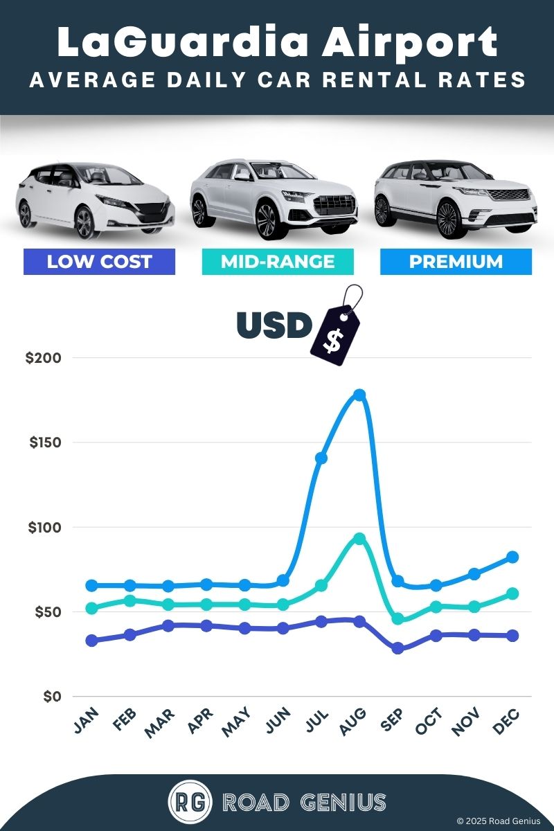 On average, car rentals at LaGuardia Airport cost around $60 per day, with the lowest-priced rentals starting at $29 per day.
