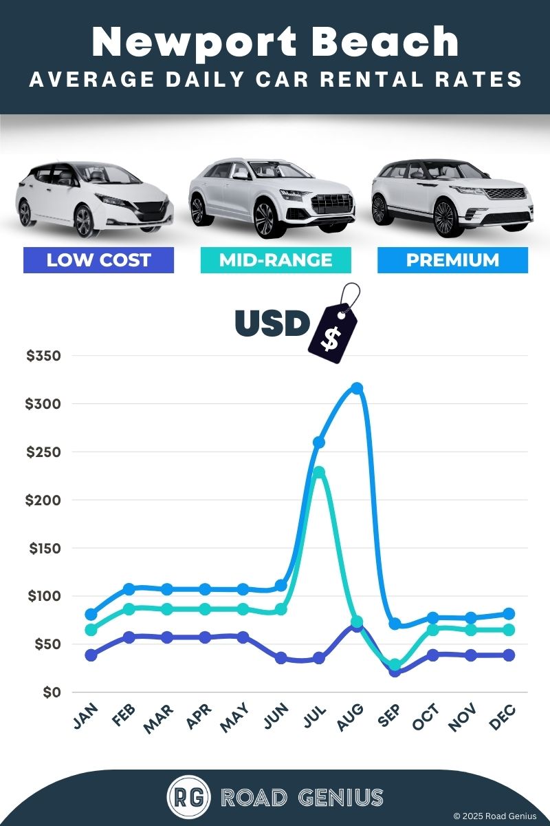 On average, car rentals in Newport Beach cost around $85 per day, with the lowest-priced rentals starting at $22 per day.
