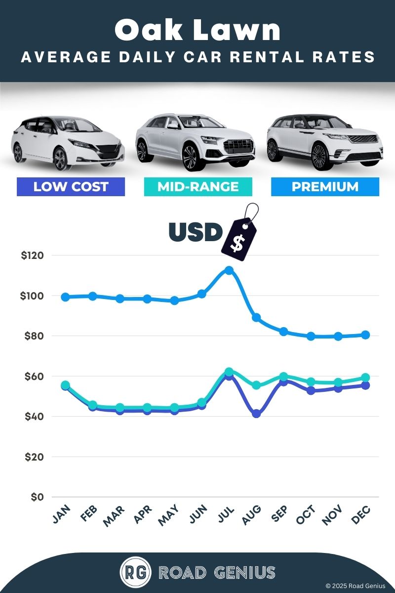 On average, car rentals in Oak Lawn cost around $65 per day, with the lowest-priced rentals starting at $41 per day.