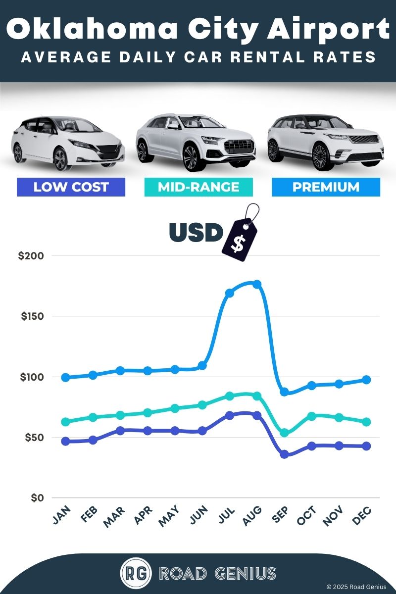 On average, car rentals at Oklahoma City Airport cost around $78 per day, with the lowest-priced rentals starting at $36 per day.