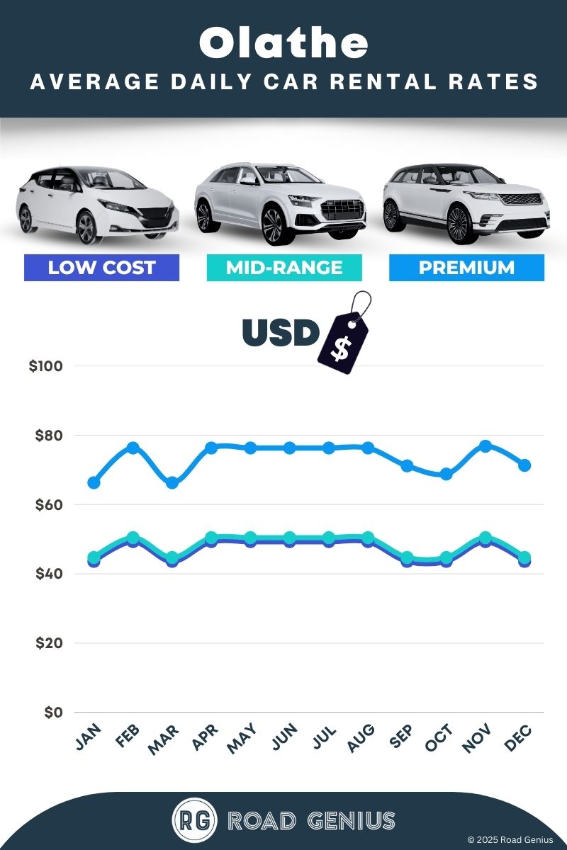 On average, car rentals in Olathe cost around $56 per day, with the lowest-priced rentals starting at $44 per day.