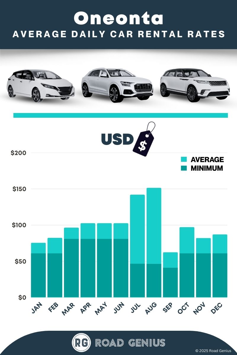 On average, car rentals in Oneonta cost around $85 per day, with the lowest-priced rentals starting at $41 per day.