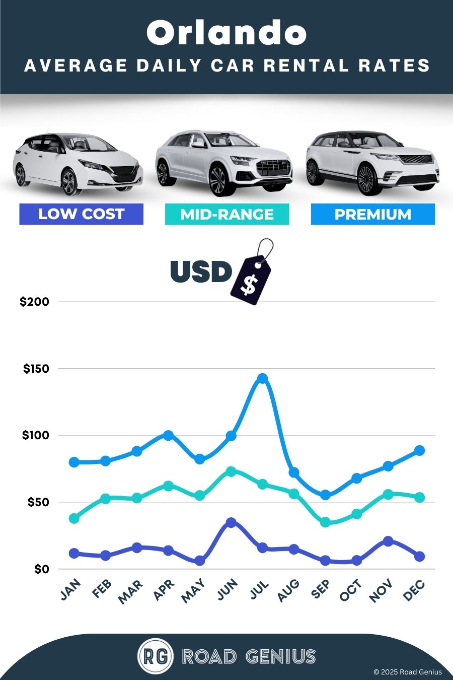 On average, car rentals in Orlando cost around USD $51 per day, with the lowest-priced rentals available from USD $6 per day.