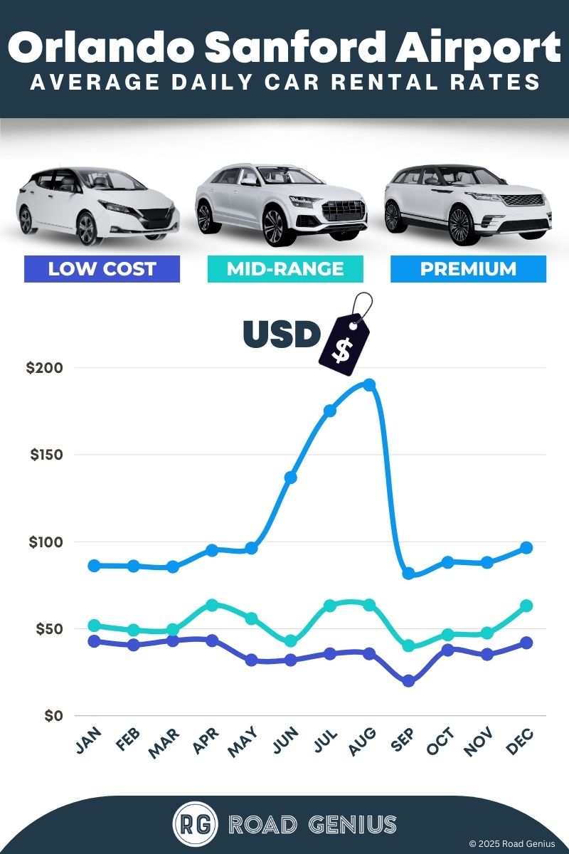 On average, car rentals at Orlando Sanford Airport cost around $66 per day, with the lowest-priced rentals starting at $20 per day.