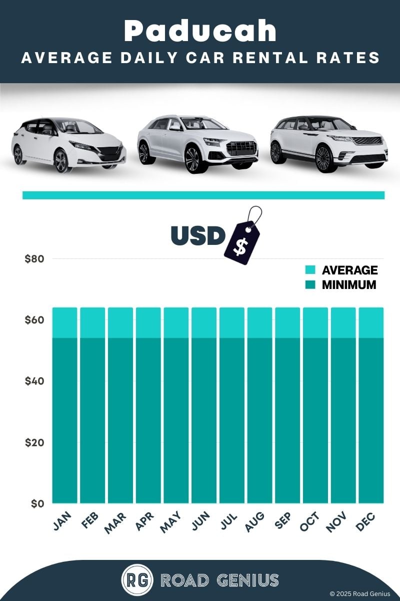 On average, car rentals in Paducah cost around $63 per day, with the lowest-priced rentals starting at $54 per day.