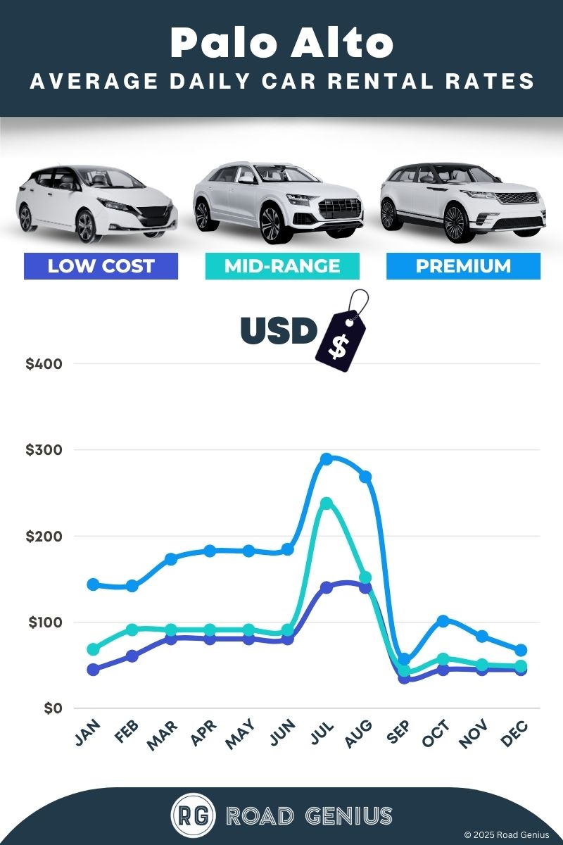 On average, car rentals in Palo Alto cost around $107 per day, with the lowest-priced rentals starting at $35 per day.