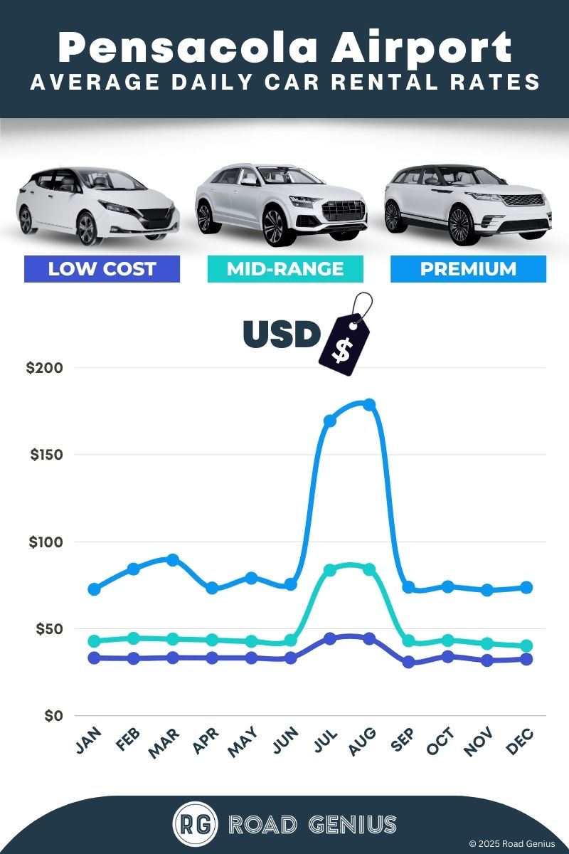 On average, car rentals at Pensacola Airport cost around $59 per day, with the lowest-priced rentals starting at $31 per day.