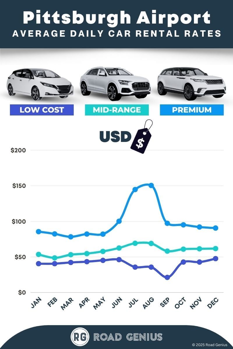 On average, car rentals at Pittsburgh Airport cost around $66 per day, with the lowest-priced rentals starting at $21 per day.