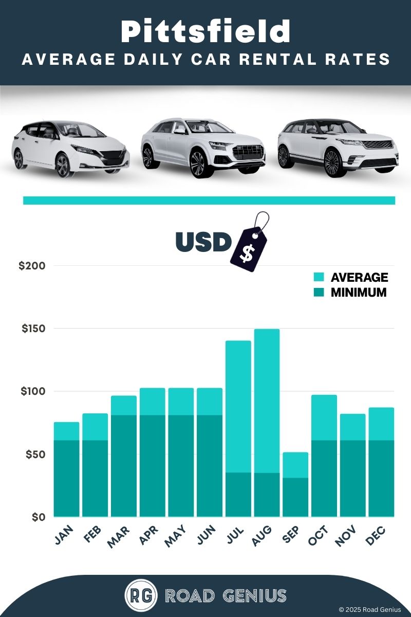 On average, car rentals in Pittsfield cost around $84 per day, with the lowest-priced rentals starting at $31 per day.