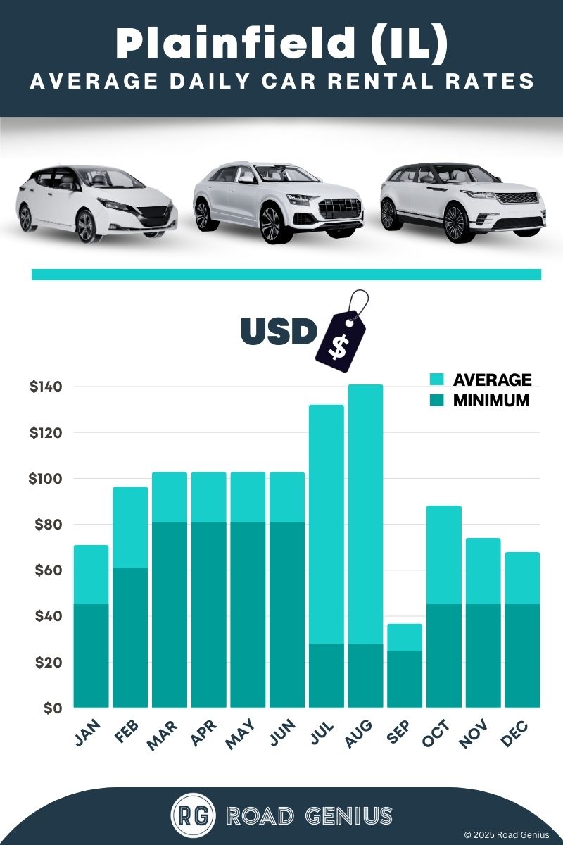 On average, car rentals in Plainfield (IL) cost around $79 per day, with the lowest-priced rentals starting at $24 per day.