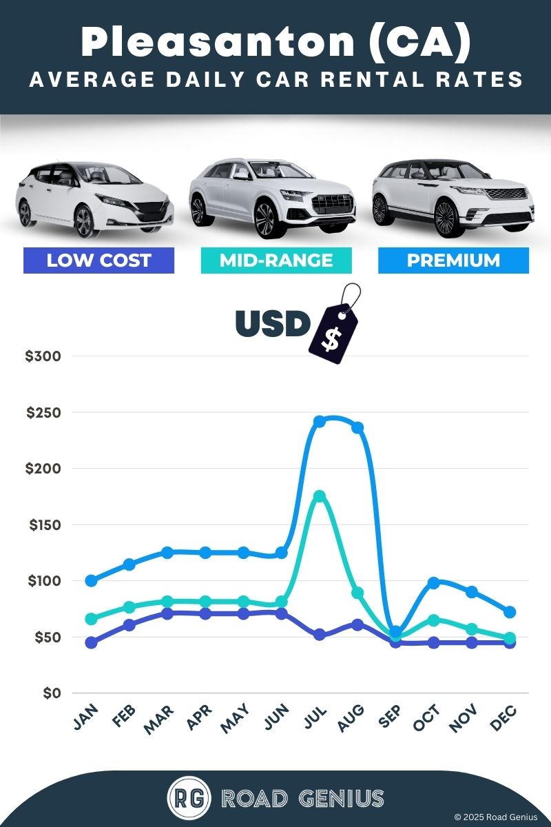 On average, car rentals in Pleasanton (CA) cost around $87 per day, with the lowest-priced rentals starting at $45 per day.