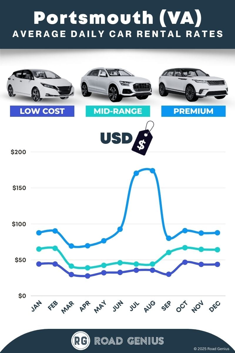 On average, car rentals in Portsmouth (VA) cost around $63 per day, with the lowest-priced rentals starting at $28 per day.