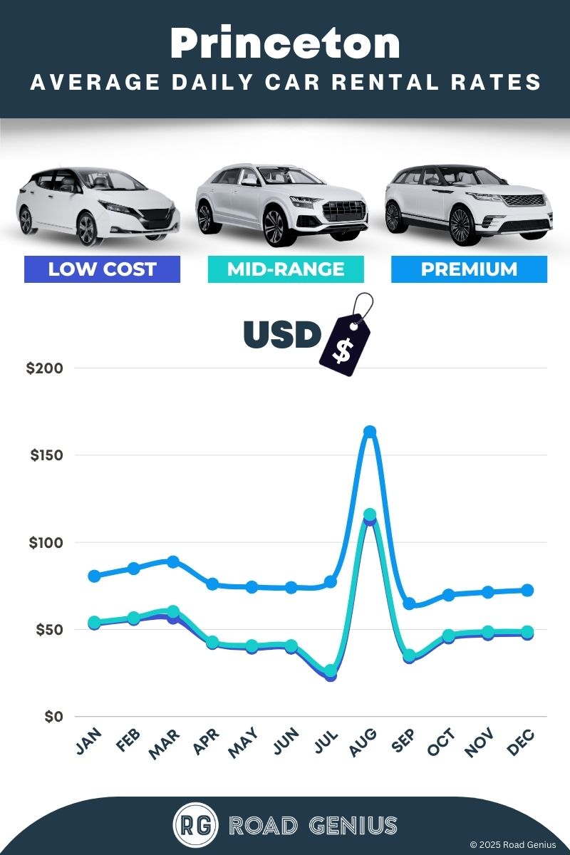 On average, car rentals in Princeton cost around $61 per day, with the lowest-priced rentals starting at $24 per day.