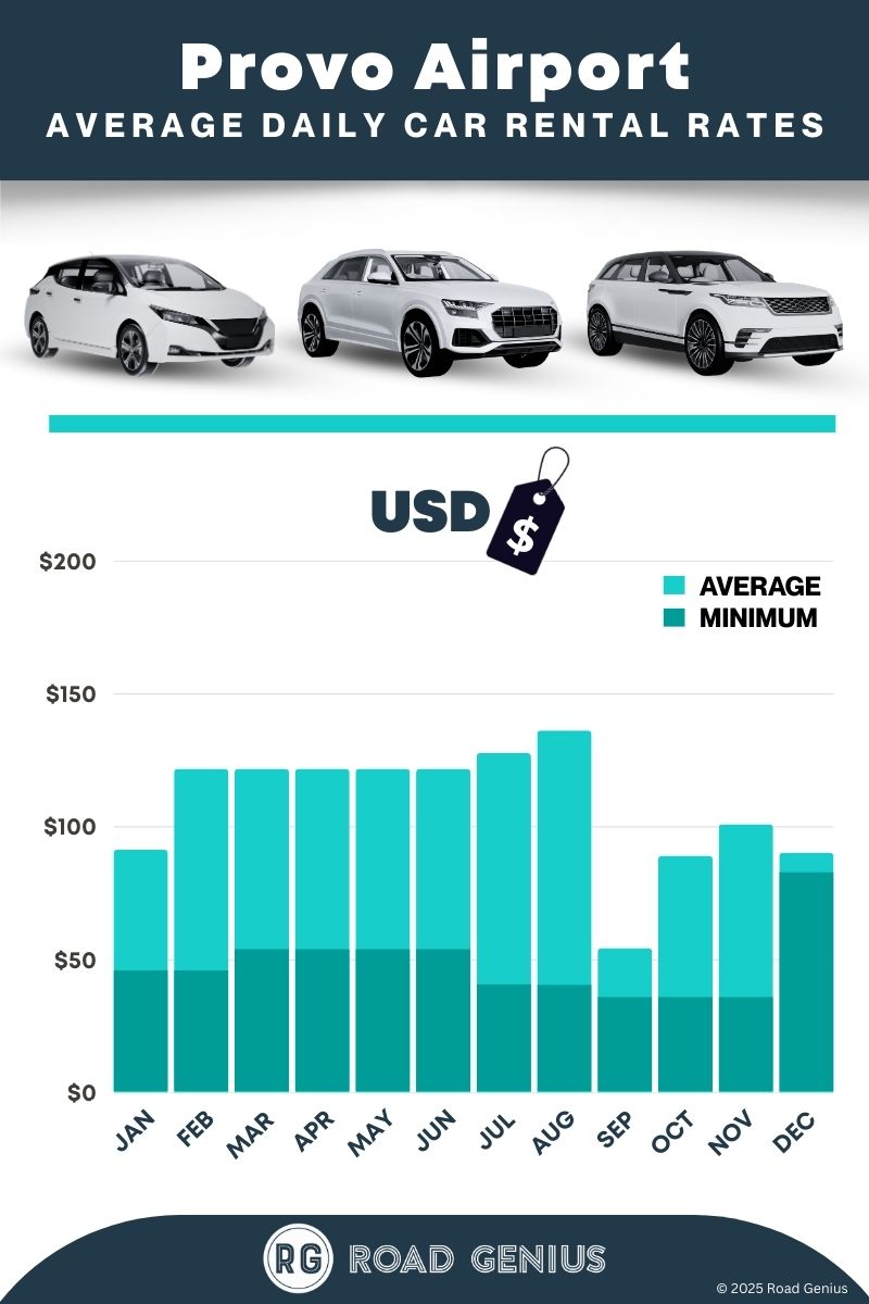 On average, car rentals at Provo Airport cost around $77 per day, with the lowest-priced rentals starting at $36 per day.