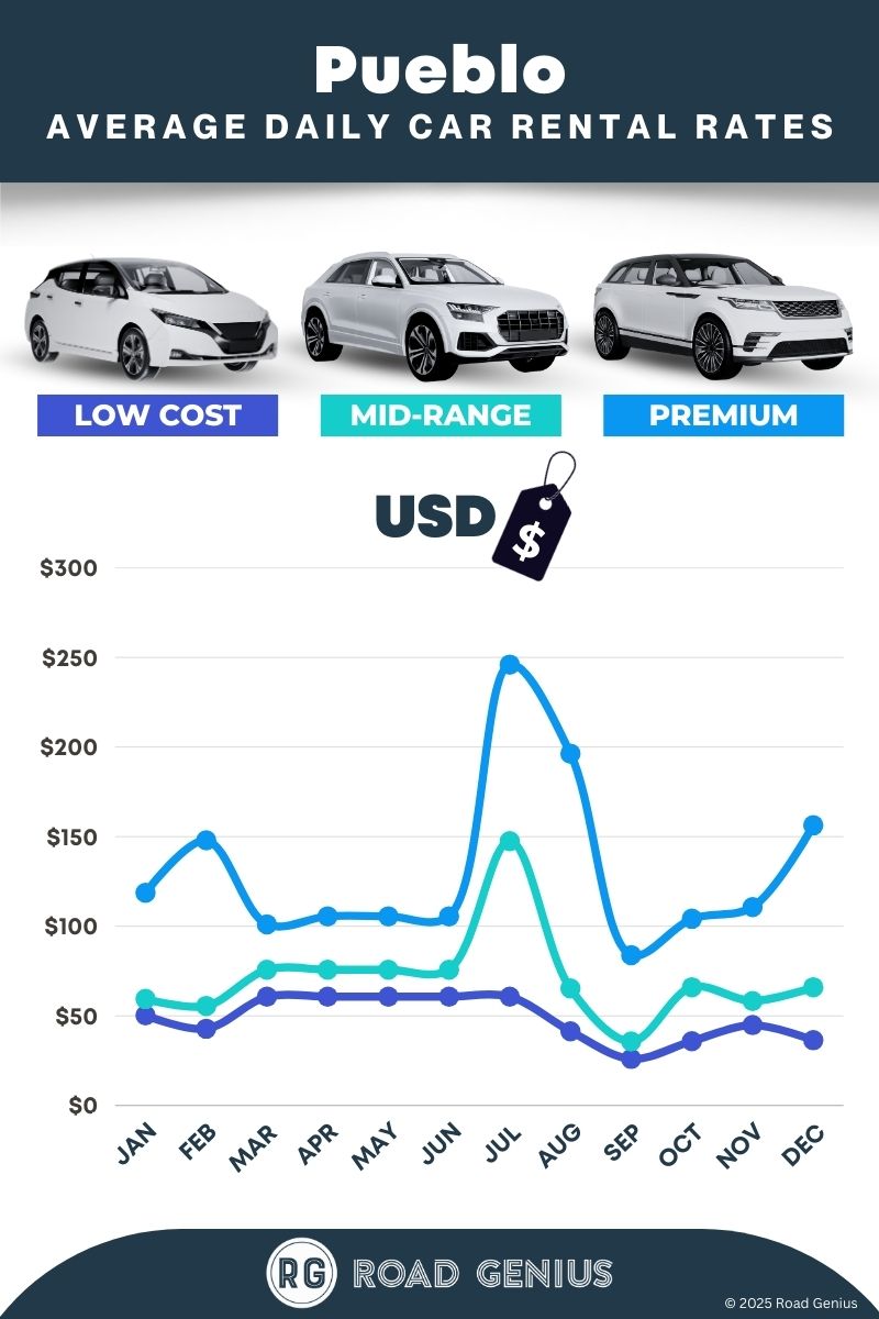 On average, car rentals in Pueblo cost around $84 per day, with the lowest-priced rentals starting at $26 per day.