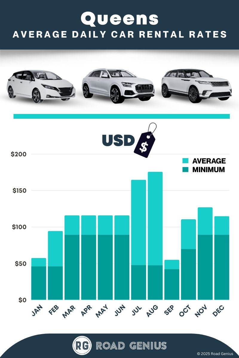 On average, car rentals in Queens cost around $99 per day, with the lowest-priced rentals starting at $42 per day.