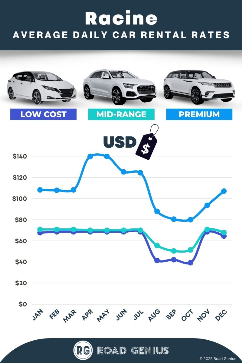 On average, car rentals in Racine cost around $78 per day, with the lowest-priced rentals starting at $39 per day.