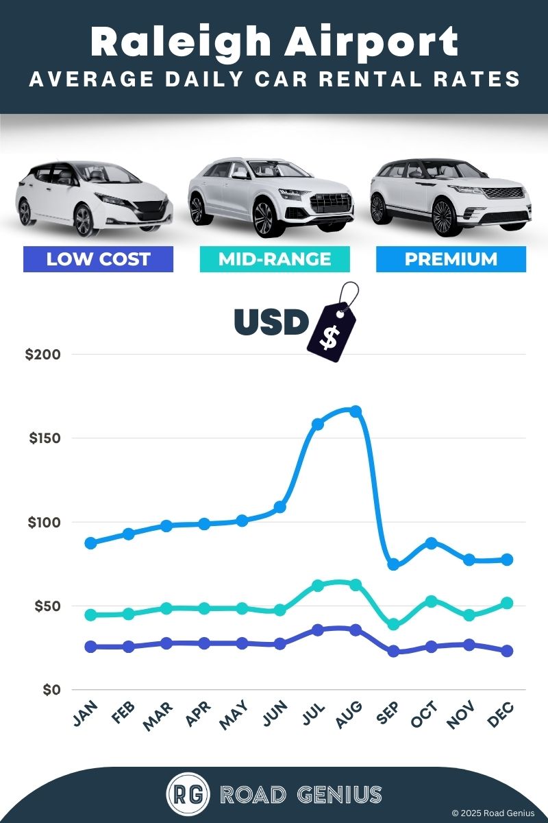 On average, car rentals at Raleigh Airport cost around $60 per day, with the lowest-priced rentals starting at $23 per day.