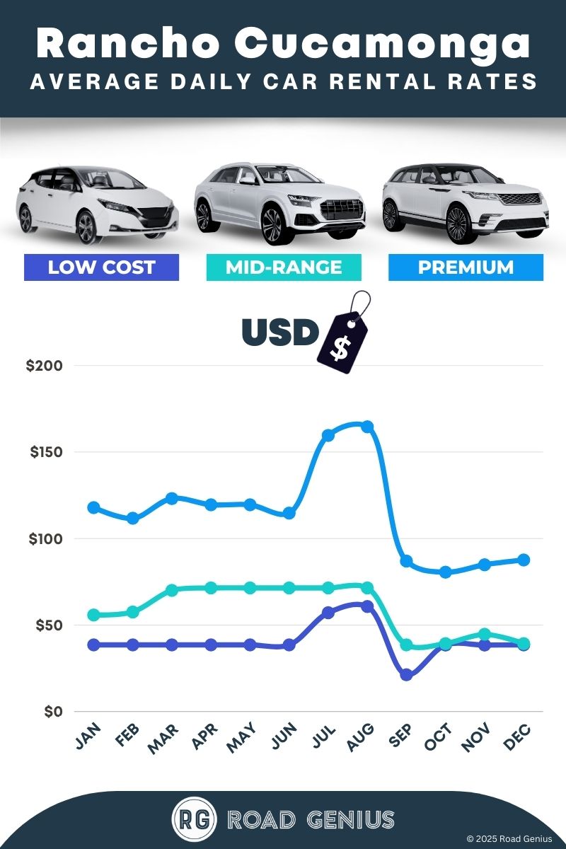 On average, car rentals in Rancho Cucamonga cost around $71 per day, with the lowest-priced rentals starting at $21 per day.
