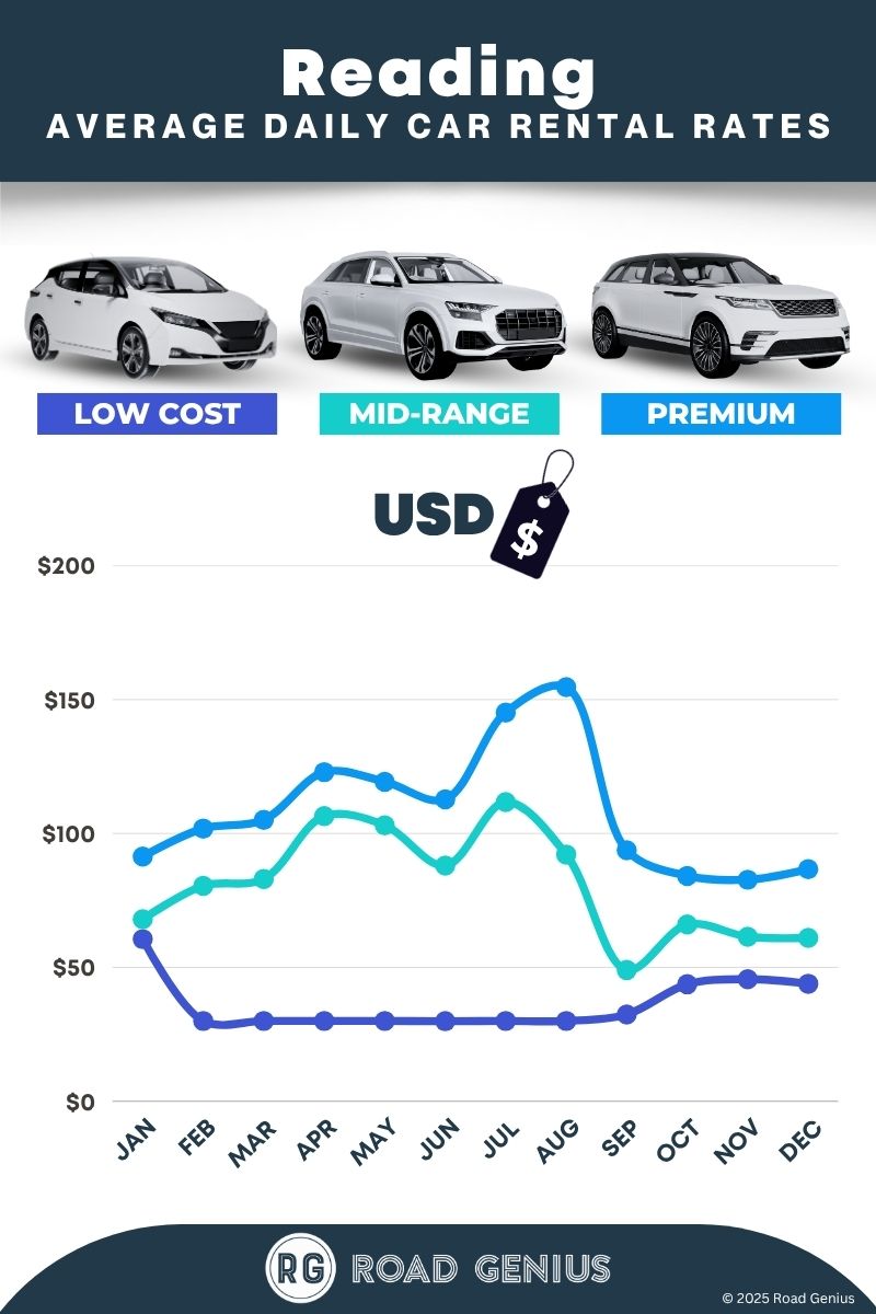 On average, car rentals in Reading cost around $75 per day, with the lowest-priced rentals starting at $30 per day.
