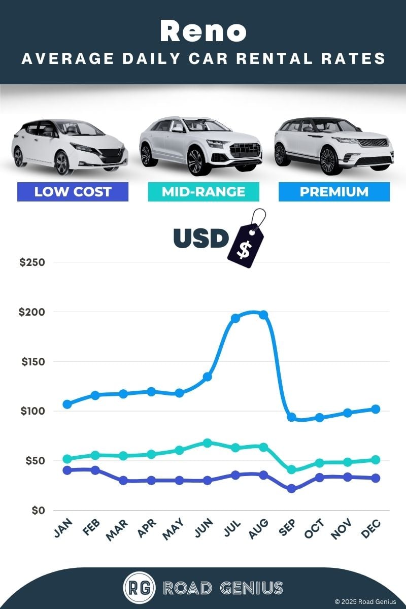 On average, car rentals in Reno cost around $71 per day, with the lowest-priced rentals starting at $22 per day.