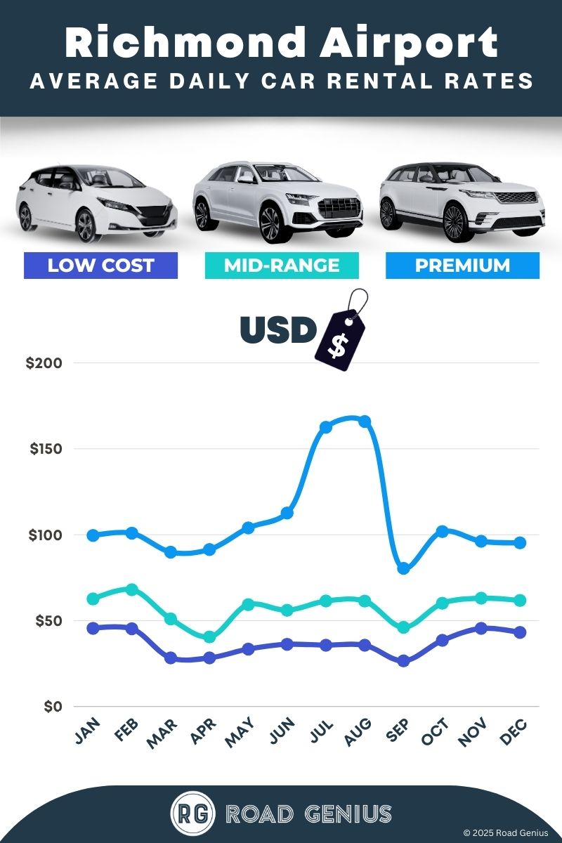 On average, car rentals at Richmond Airport cost around $68 per day, with the lowest-priced rentals starting at $27 per day.