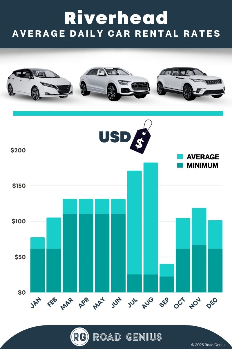 On average, car rentals in Riverhead cost around $103 per day, with the lowest-priced rentals starting at $22 per day.