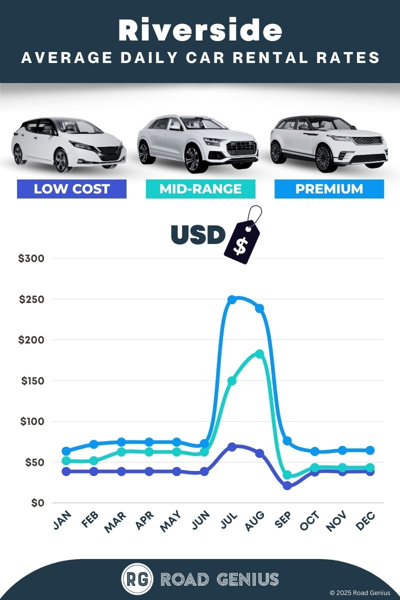On average, car rentals in Riverside cost around $70 per day, with the lowest-priced rentals starting at $21 per day.