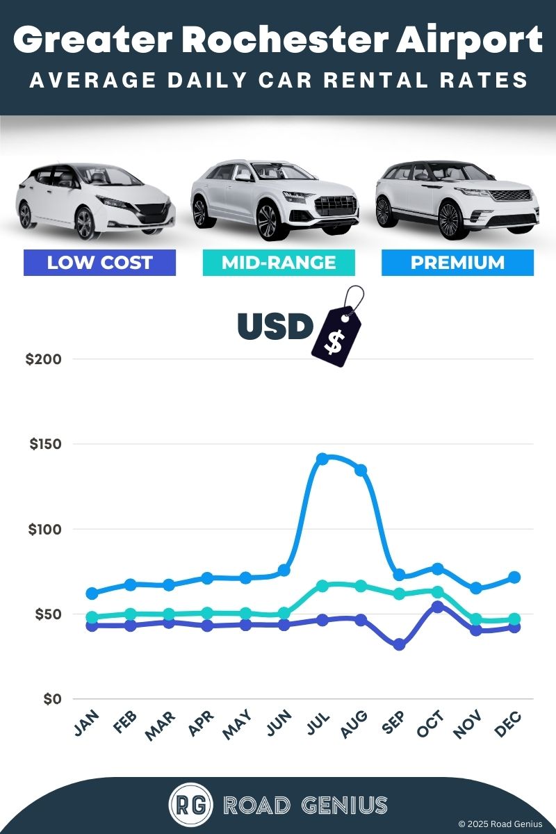 On average, car rentals at Greater Rochester Airport cost around $60 per day, with the lowest-priced rentals starting at $32 per day.