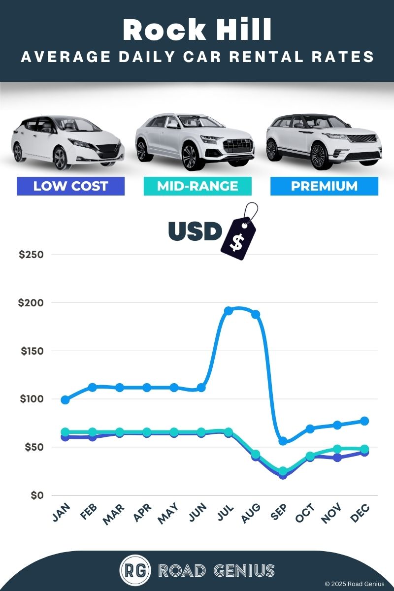 On average, car rentals in Rock Hill cost around $72 per day, with the lowest-priced rentals starting at $21 per day.