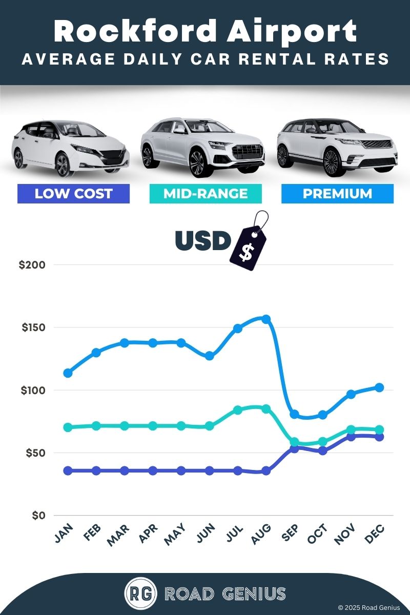 On average, car rentals at Rockford Airport cost around $78 per day, with the lowest-priced rentals starting at $36 per day.