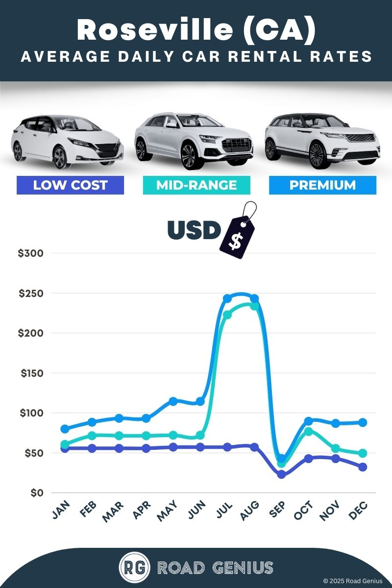On average, car rentals in Roseville (CA) cost around $85 per day, with the lowest-priced rentals starting at $23 per day.