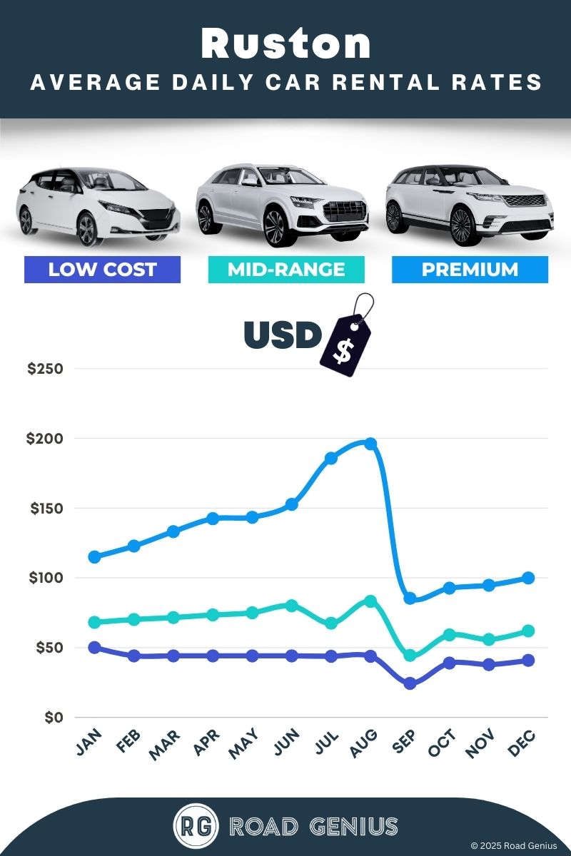 On average, car rentals in Ruston cost around $80 per day, with the lowest-priced rentals starting at $24 per day.
