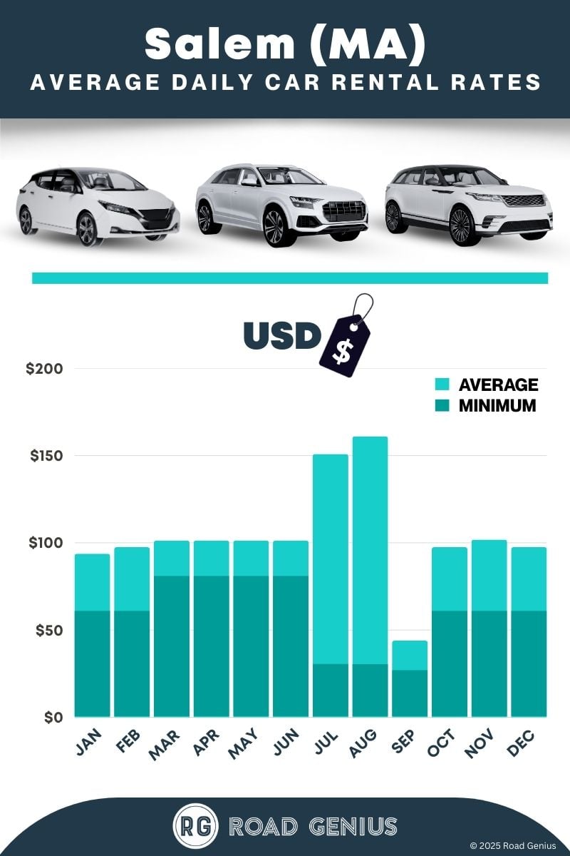 On average, car rentals in Salem (MA) cost around $90 per day, with the lowest-priced rentals starting at $27 per day.