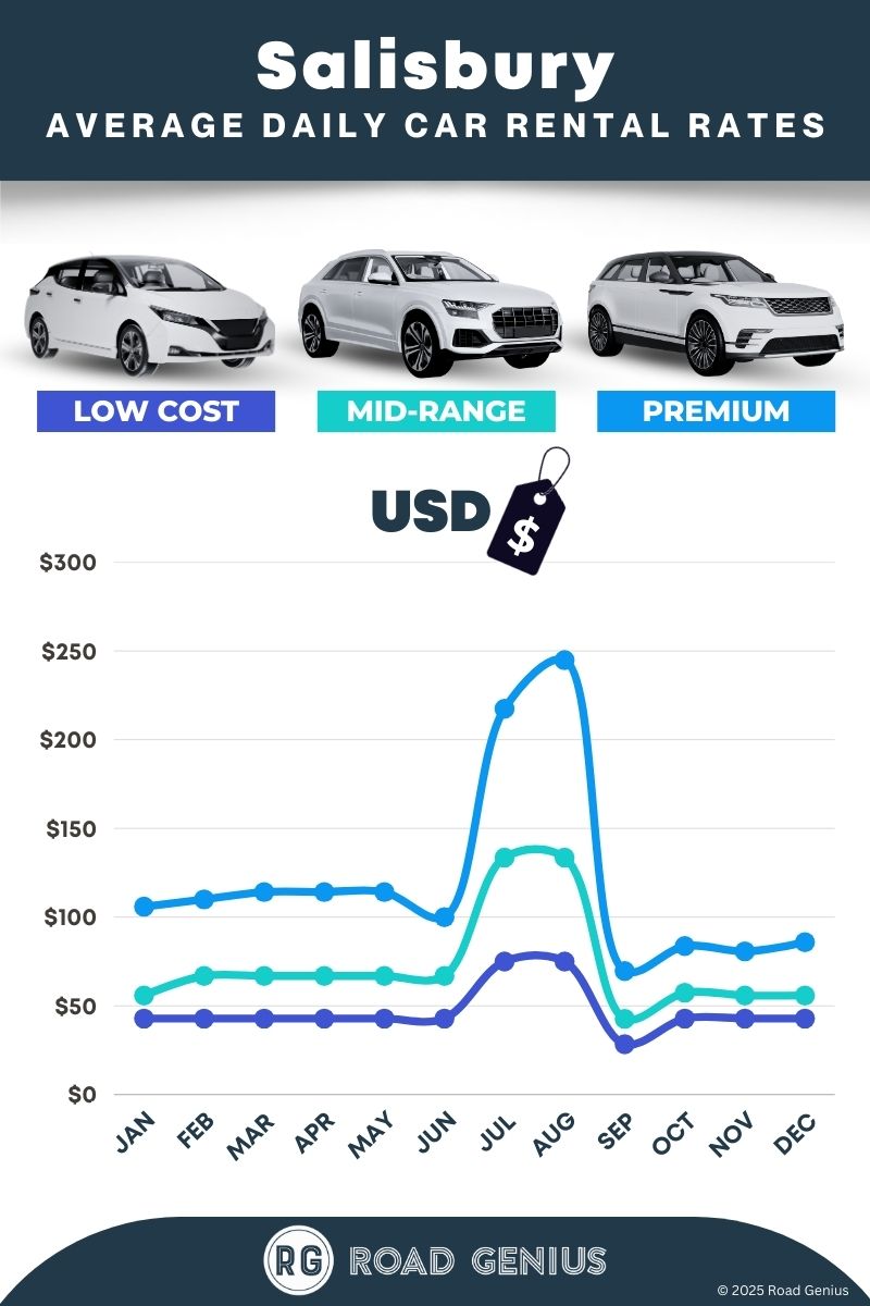 On average, car rentals in Salisbury cost around $80 per day, with the lowest-priced rentals starting at $28 per day.