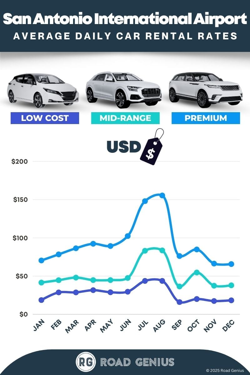 On average, car rentals at San Antonio International Airport cost around $57 per day, with the lowest-priced rentals starting at $16 per day.