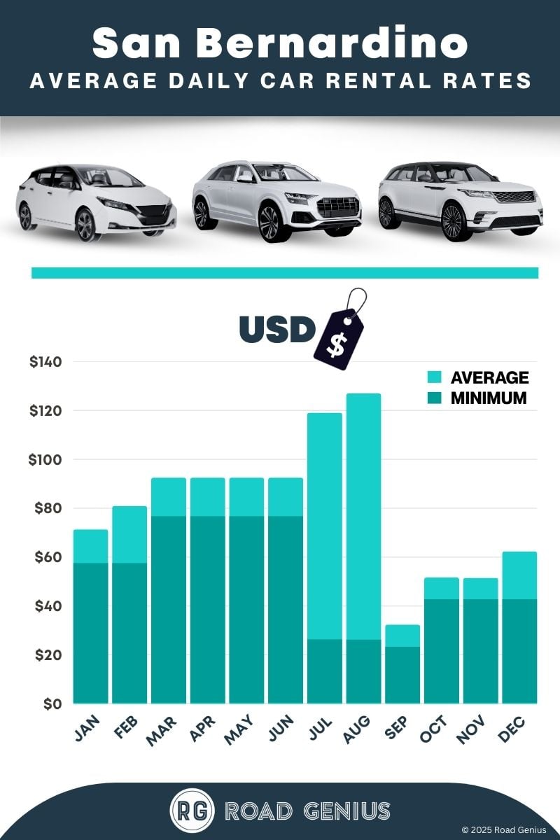 On average, car rentals in San Bernardino cost around $71 per day, with the lowest-priced rentals starting at $23 per day.