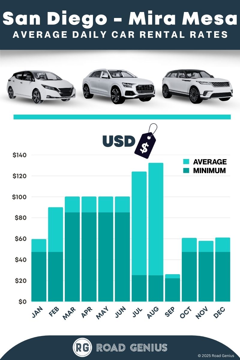 On average, car rentals in San Diego - Mira Mesa cost around $74 per day, with the lowest-priced rentals starting at $22 per day.