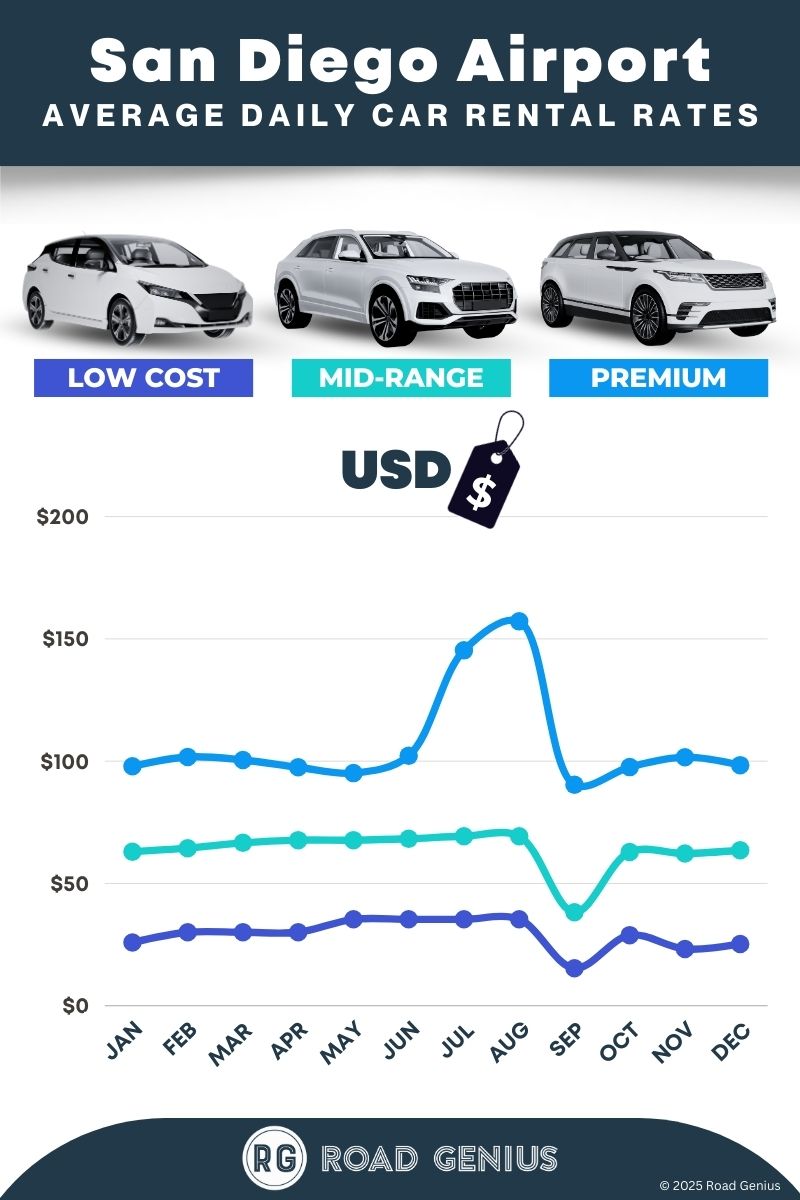 On average, car rentals at San Diego Airport cost around $67 per day, with the lowest-priced rentals starting at $15 per day.