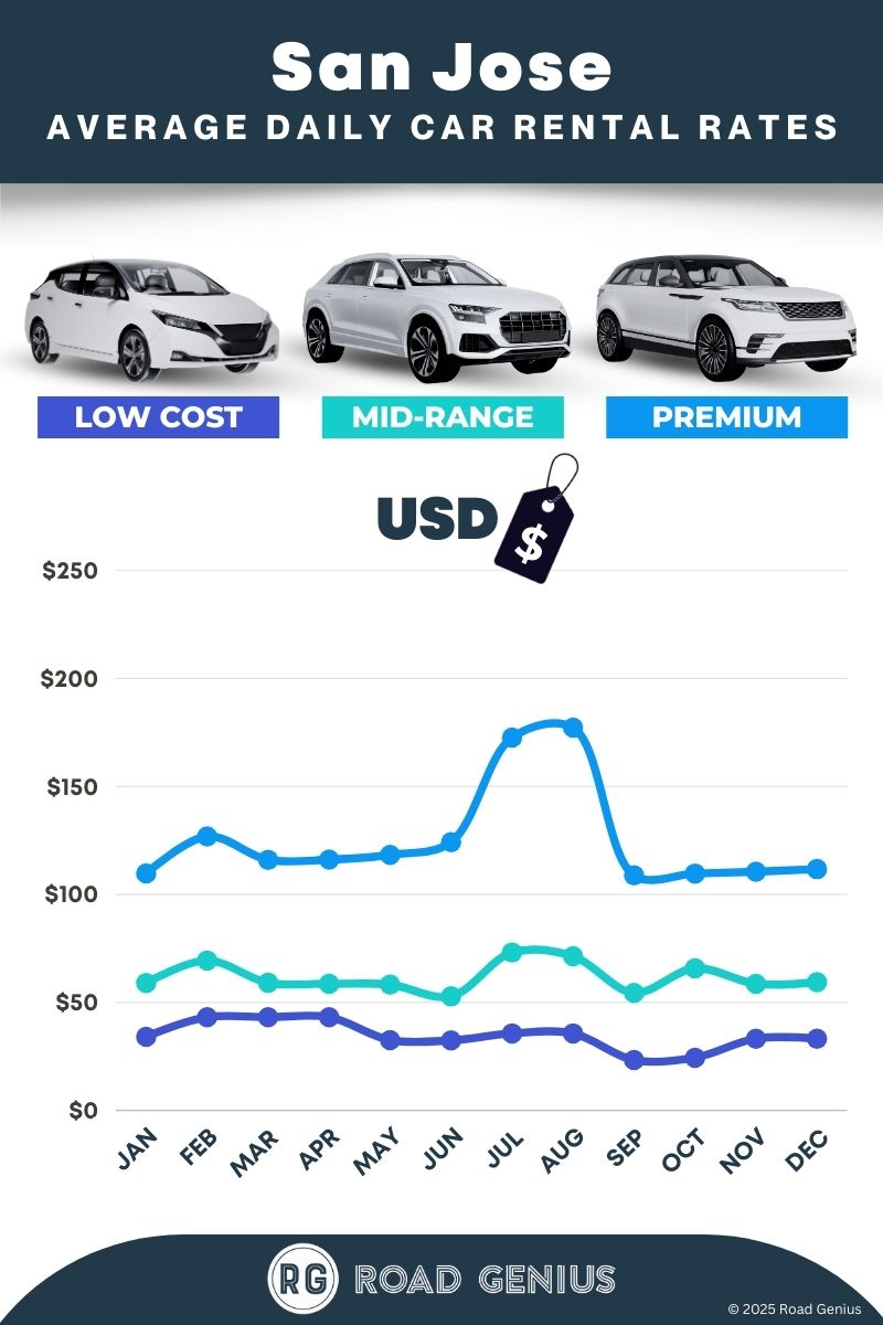 On average, car rentals in San Jose cost around $74 per day, with the lowest-priced rentals starting at $23 per day.