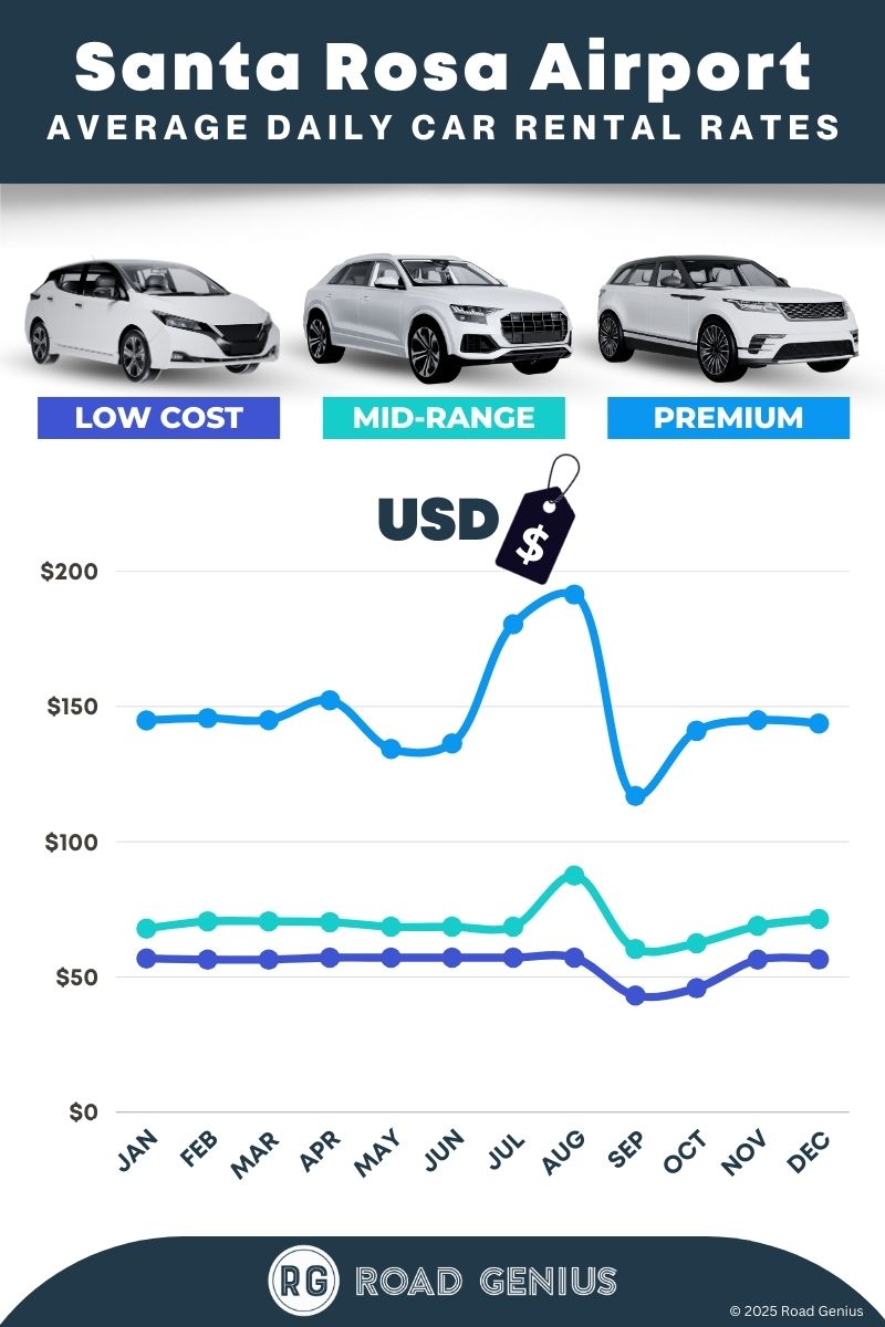 On average, car rentals at Santa Rosa Airport cost around $91 per day, with the lowest-priced rentals starting at $43 per day.
